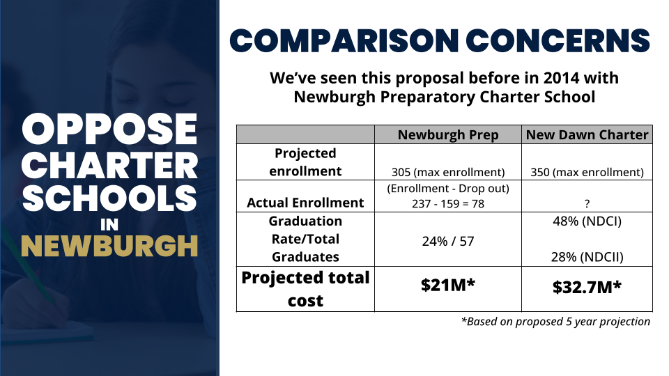 We know that this effort has not worked in our community before. Despite the best efforts led by actual members of our community who had deep connections with our residents at that time, the previous charter school in Newburgh failed. The proposals between the previous charter school and today's proposal are almost identical. The comparison information is eye opening and speaks for itself.