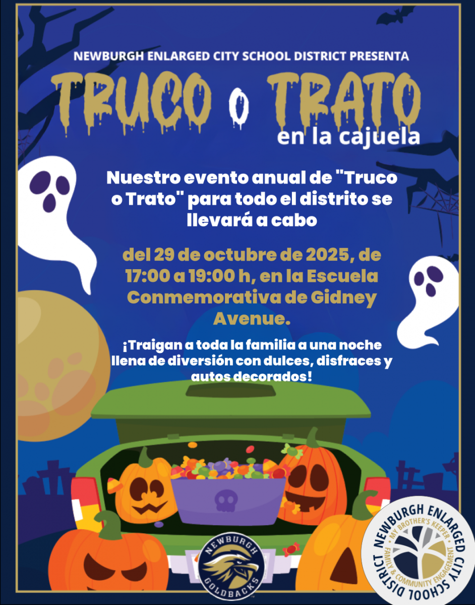 Nuestro evento anual "Dulces y Tratos" se llevará a cabo el 29 de octubre de 5 p. m. a 7 p. m. en la Escuela Conmemorativa Gidney Avenue (GAMS). ¡Bienvenidos todos los estudiantes y familias del NECSD!