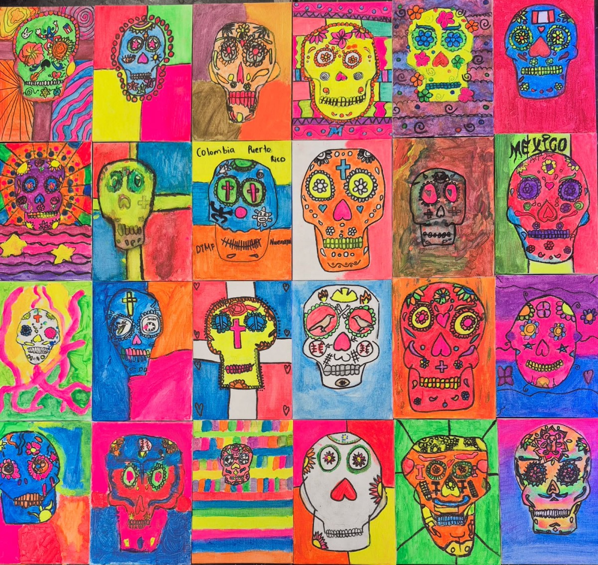 Students in Ms. McCarthy's class painted Sugar Skulls in honor of Hispanic Heritage Month. Students rendered images rich with cultural symbolism, honoring their heritage. These were painted with fluorescent light that glows in the dark!