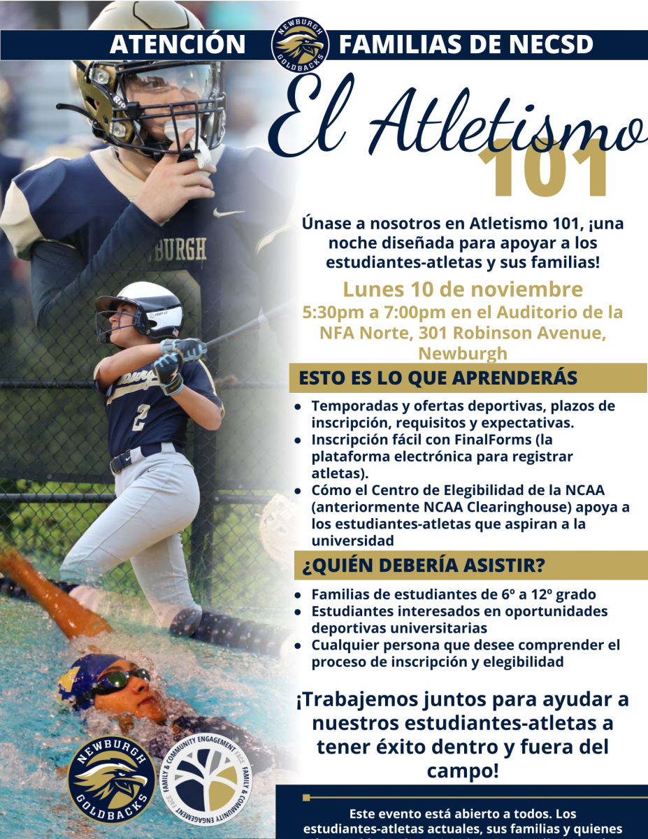 Les invitamos a la reunión informativa para padres de atletas el lunes 10 de noviembre a las 5:30 p. m. en el Campus Norte de NFA (201 Robinson Ave., Newburgh). ¡Todos los estudiantes-atletas actuales y los interesados, junto con sus familias, son bienvenidos!