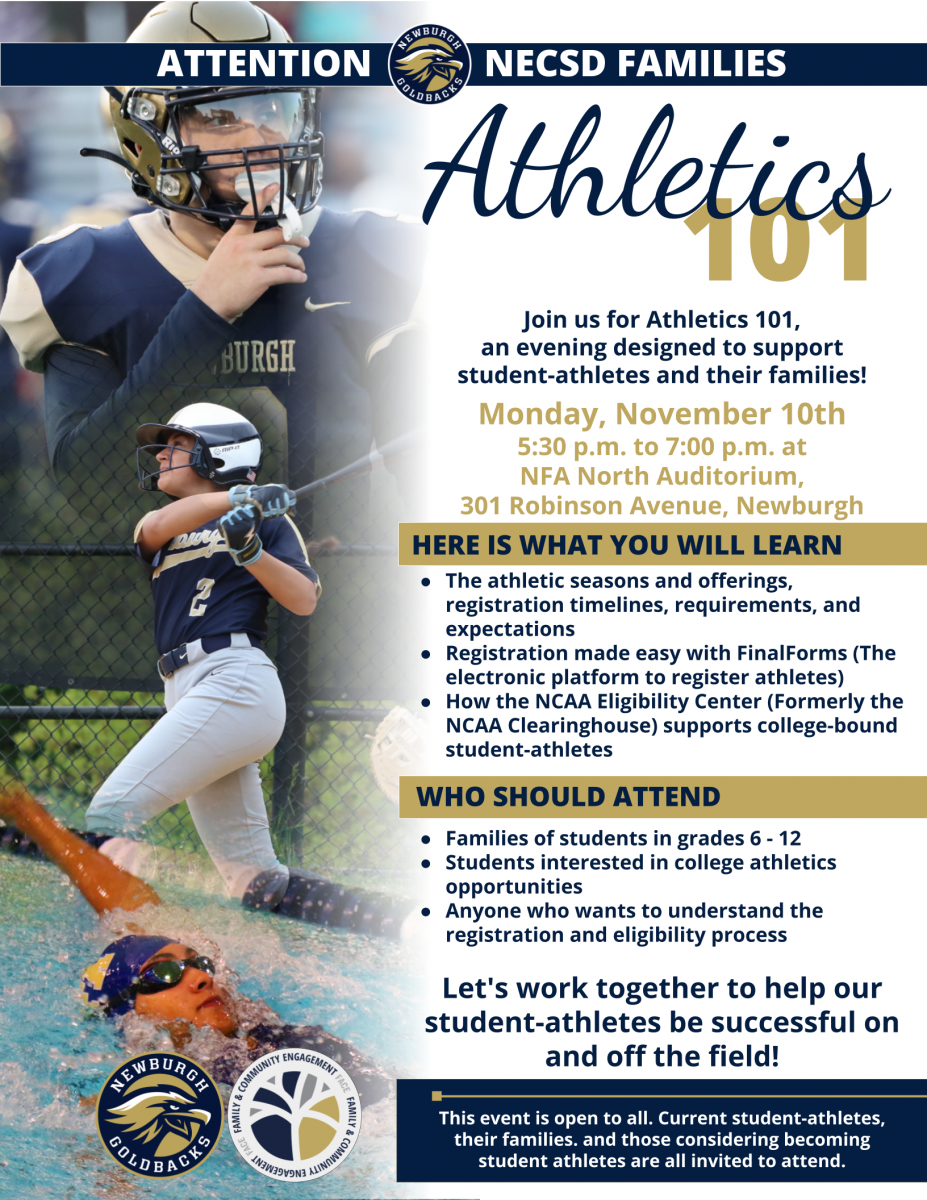 We invite you to join us for an Athletics Parents Informational Meeting on Monday, November 10th at 5:30 pm at NFA North Campus (201 Robinson Ave., Newburgh). All current and interested student-athletes and their families are welcome!