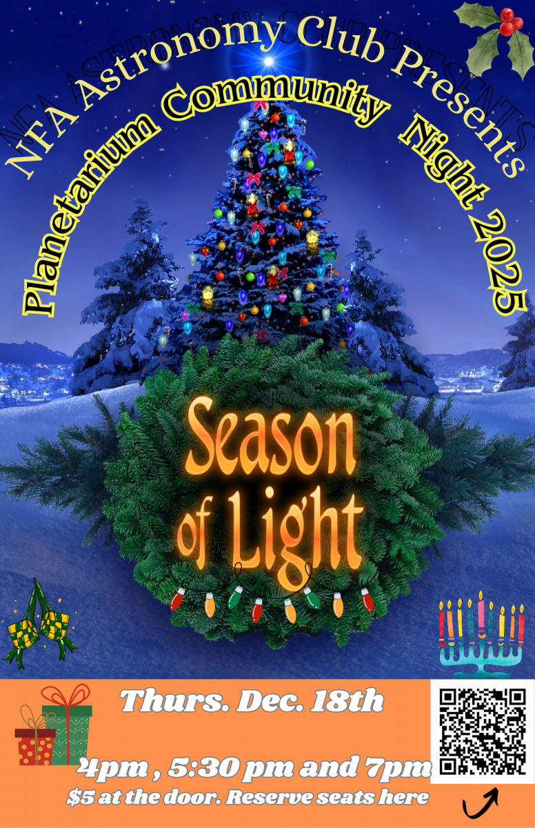 Hosted in the NFA Planetarium, the NFA Astronomy Club will be presenting their traditional show, The Season of Light, about the traditions around the Winter Solstice including holidays.