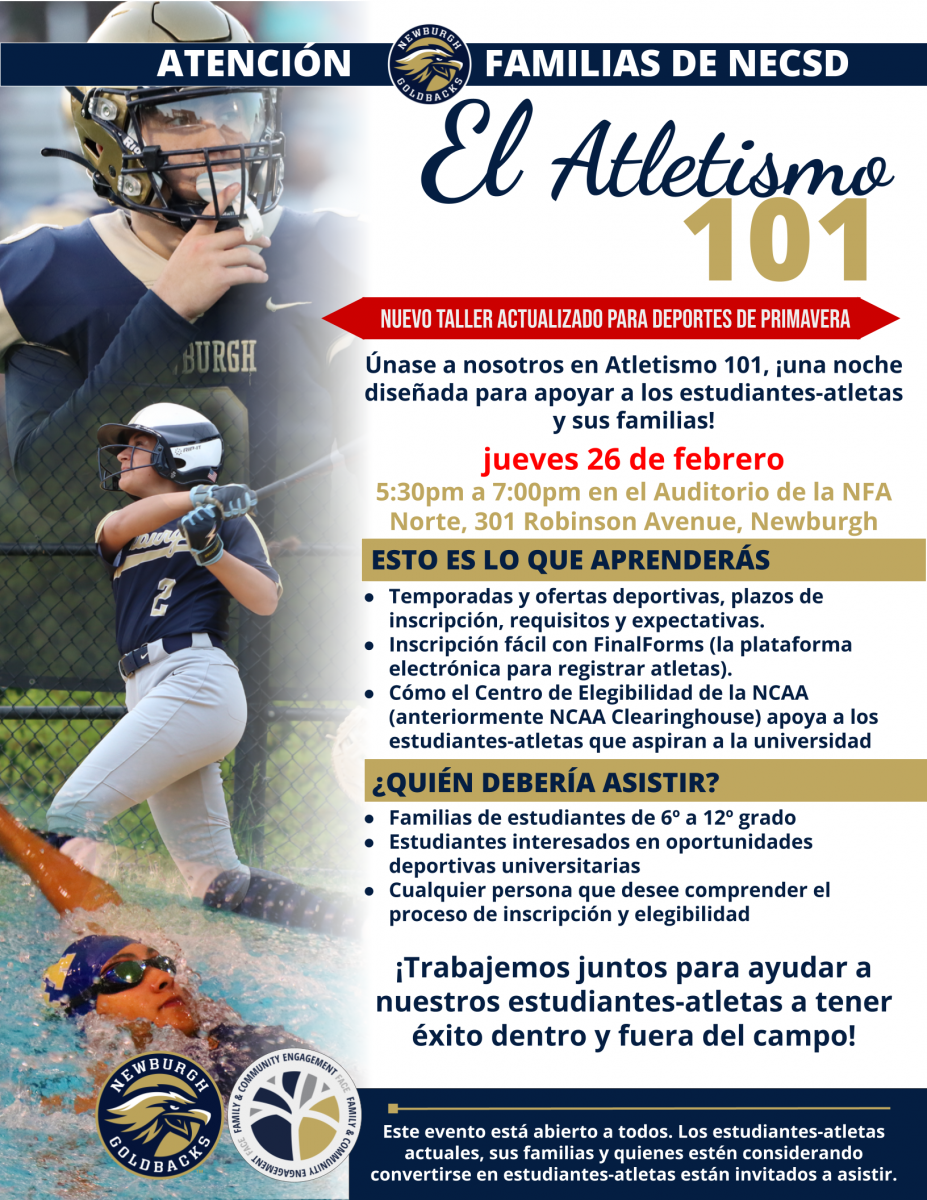 Los invitamos a nuestra Reunión Informativa para Padres de Atletismo el jueves 26 de febrero a las 17:30 h en el Campus Norte de la NFA (201 Robinson Ave., Newburgh). ¡Bienvenidos todos los estudiantes-atletas, tanto actuales como interesados, y sus familias!